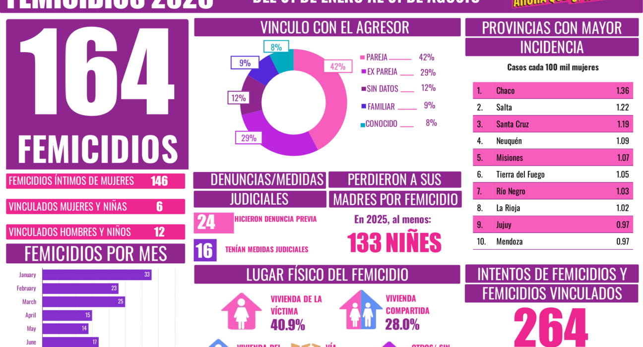 Desde el Observatorio “Ahora Que Sí Nos Ven” dieron a conocer las cifras de femicidios en Argentina entre el 1 de enero y el 31 de agosto de 2025, elaboradas a partir del análisis de medios de comunicación de todo el país.