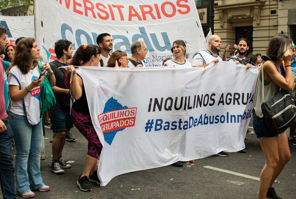 En este contexto tan adverso Luci Cavallero destacó que «hay que seguir profundizando la lucha inquilina, politizando la condición inquilina porque si algo ha pasado históricamente es que se trata de borrar que hay una relación de poder con el mito de que todos en algún momento vamos a ser propietarios». Por otra parte, «estamos pidiendo que el Congreso rechace el DNU 70/23 que en su artículo 21 deroga la ley de Alquileres, eso fue rechazado por una de las cámaras y nunca más se volvió a sesionar para rechazarlo en las dos cámaras». Luci también se refirió a otras estrategias de protección estatal ante las arbitrariedades del mercado inmobiliario y afirmó que «seguimos insistiendo por el impuesto a las viviendas vacías, por políticas públicas como la provisión de viviendas de alquiler público. Hay un montón de cosas que se podrían hacer, y todo exige lucha y organización, pero hay algo que tiene en la mano la clase política para, por lo menos, ponerle un pequeño límite a lo que está siendo esta supuesta libertad que es libertad para los propietarios».